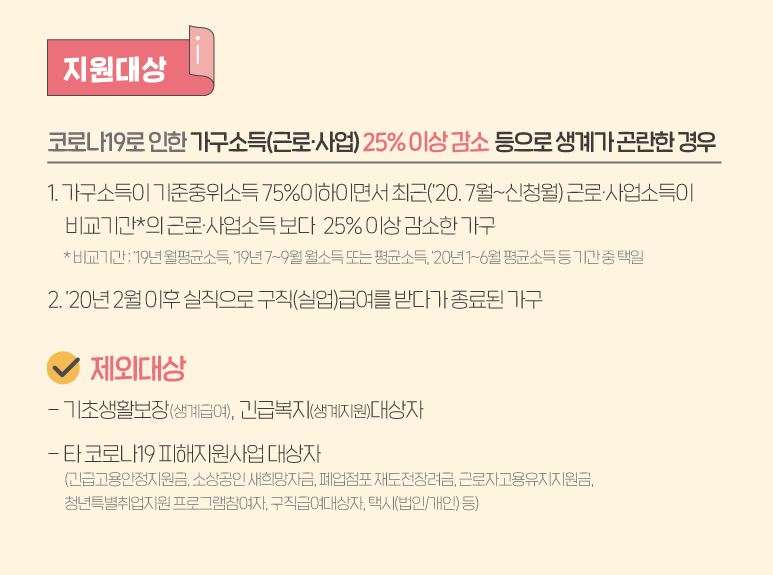 구직급여 수급중이거나, 직접 일자리 사업에 참여중인 자, 긴급 고용안정지원금* 및 소상공인 새희망자금 수급자는 중복수급 불가