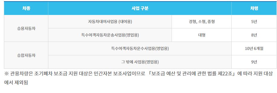 (단, 차령이 초과된 차량 중 자가용으로 용도변경 후 일정(2년) 기간 운행한 차량은 지원 가능) -아래 표 참조-