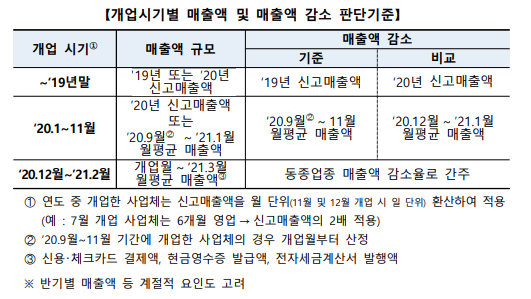 * ’20년 기준 매출액이 10~120억 원 이하(음식‧숙박: 10억 원, 도소매: 50, 제조: 120 등) * 상시 근로자수 무관하게 지원